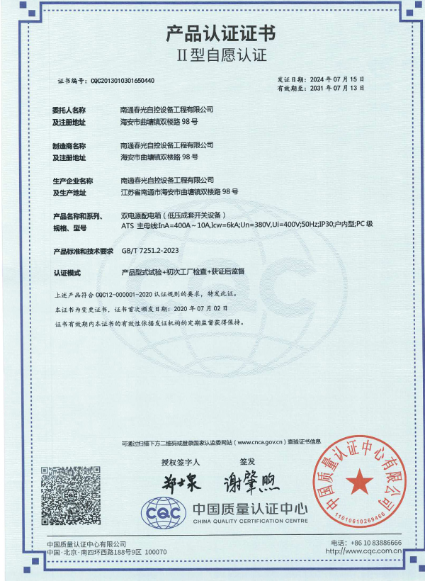 交流低壓配電柜認證證書