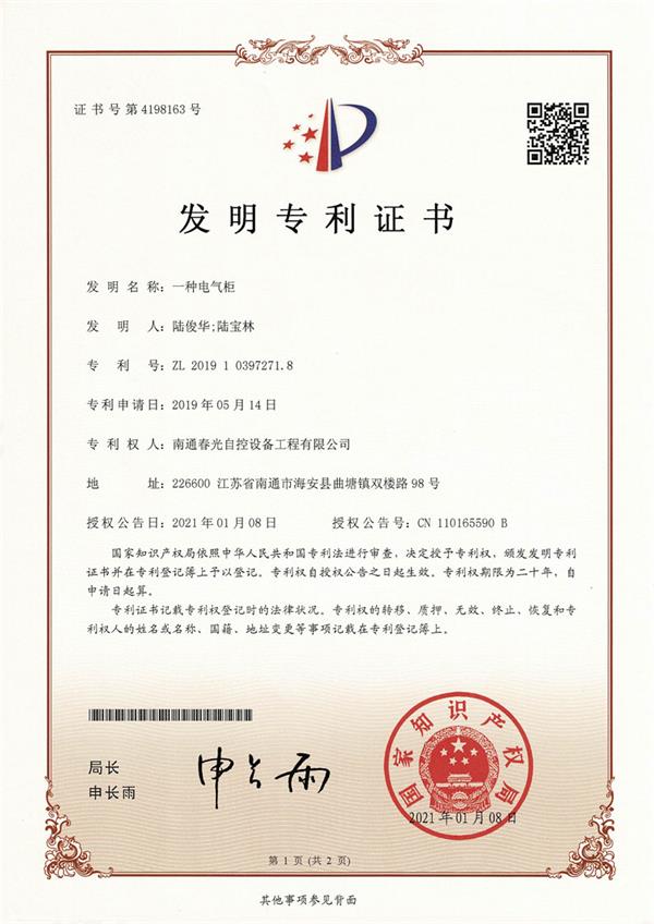 一種電氣柜專利證書