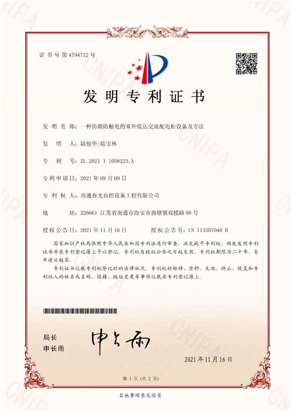 一種防潮防觸電的室外低壓交流配電柜設備及方法發明專利證書